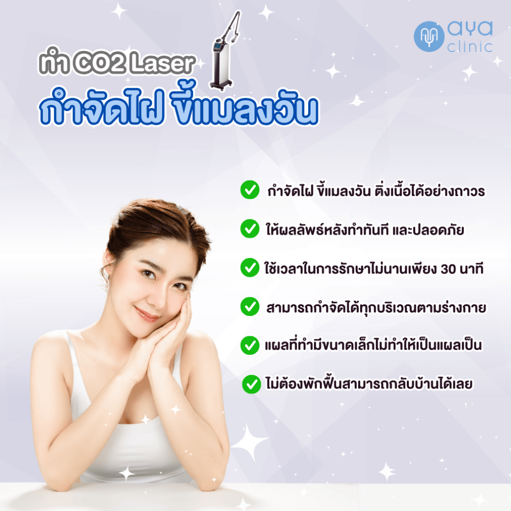 หากคุณไม่แน่ใจว่าจุดบนร่างกายคืออะไร หรือต้องการกำจัดเพื่อความสวยงาม เข้ามาปรึกษากับเราที่ AYA Clinic คลินิกผิวหนังและความงามครบวงจร โดยแพทย์หญิงอารียา พินิจพรดิลก (คุณหมอฝ้าย) แพทย์ผิวหนังและความงามผู้ชำนาญการ ทางคลินิกมีบริการ CO2 laser เพื่อจี้ไฝ ขี้แมลงวัน หูด กระเนื้อ ติ่งเนื้อ ด้วยเลเซอร์ ที่ส่งประจุไฟฟ้าผ่านก๊าซคาร์บอนไดออกไซด์ ซึ่งจะไม่มีเลือดไหลให้เห็น และแทบไม่ทิ้งรอยแผลเป็นไว้เลย เพื่อคืนผิวที่เรียบเนียนและสร้างความมั่นใจให้กับคุณอีกครั้ง